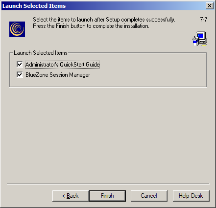 Select the desired Program Group, (BlueZone is the default). If you are going to use the BlueZone Session Manager for launching BlueZone sessions (highly recommended), it is not necessary to create any desktop shortcuts except for the Session Manager itself. If you want the BlueZone Session Manager to automatically start when Windows starts, leave the “Add BlueZone Session Manager to Startup Folder” option checked, then click the Next button.