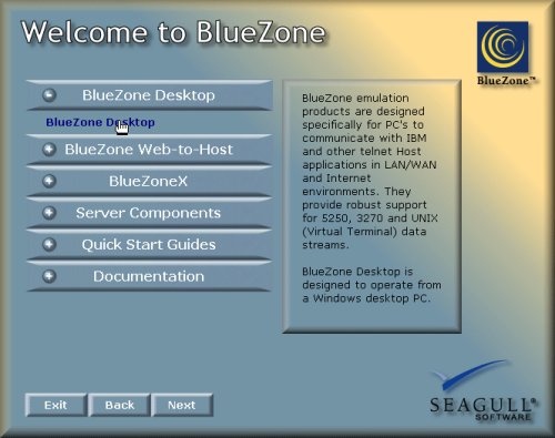 Insert the BlueZone CD-ROM into your CD drive. The BlueZone CD will automatically launch the SEAGULL BlueZone Software "Splash" screen: