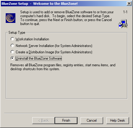 The process to un-install BlueZone is very similar to the install process. Un-installation is accomplished using the BlueZone Setup program.