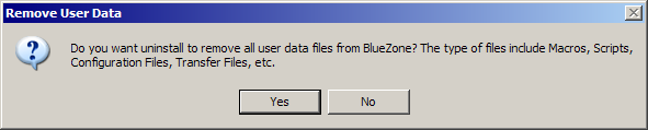 If you want to preserve your user data files such as Macros, Scripts and Configuration files, then click the No button. If you want to remove all BlueZone files including the user data files, then click the Yes button.