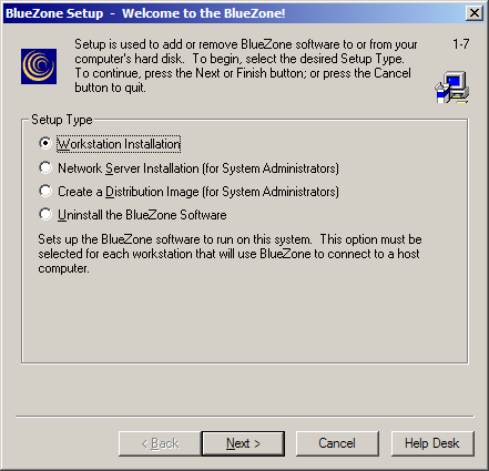 The BlueZone Setup program will display the following BlueZone Installation Dialog. Leave the Workstation Installation radio button selected and click the Next button.