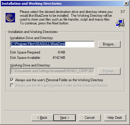 We recommend that you let BlueZone determine the correct Installation Drive and Directory and the Working Drive and Directory. Click the Next button.