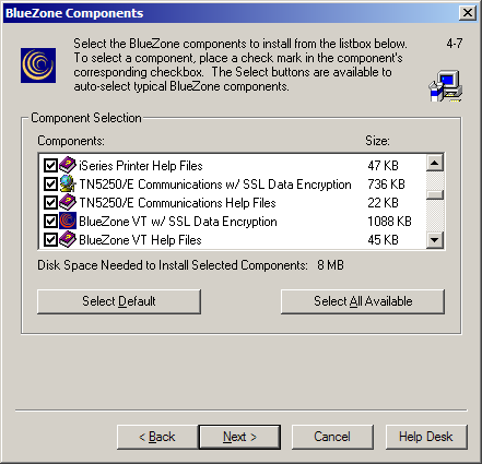 Select the BlueZone Components to be installed. To prevent a component from installing, un check the appropriate check box. Click the Next button.