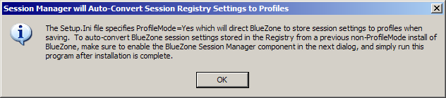 When the installation is complete, launch the new BlueZone Session Manager to convert your BlueZone configuration Registry entries into Profiles. Your BlueZone Registry entries will be automatically removed.