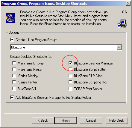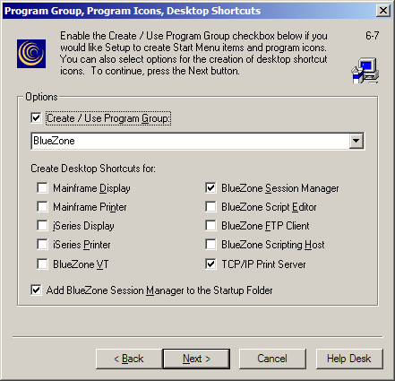 Select the desired Program Group, (BlueZone is the default). If you are going to use the BlueZone Session Manager for launching BlueZone sessions (highly recommended), it is not necessary to create any desktop shortcuts except for the Session Manager itself. If you want the BlueZone Session Manager to automatically start when Windows starts, leave the “Add BlueZone Session Manager to Startup Folder” option checked, then click the Next button.