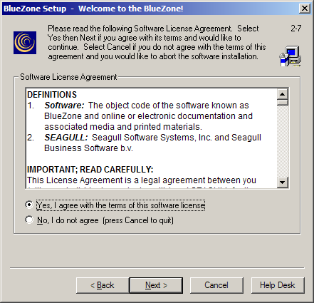 The BlueZone Software License Agreement dialog will display. Answer as appropriate then click the Next button.