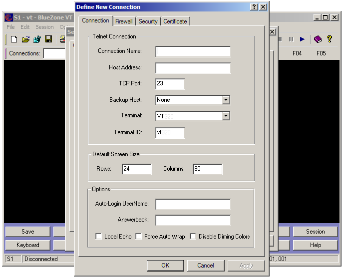When the session launches, you will automatically be taken to the Define New Connection dialog as shown: