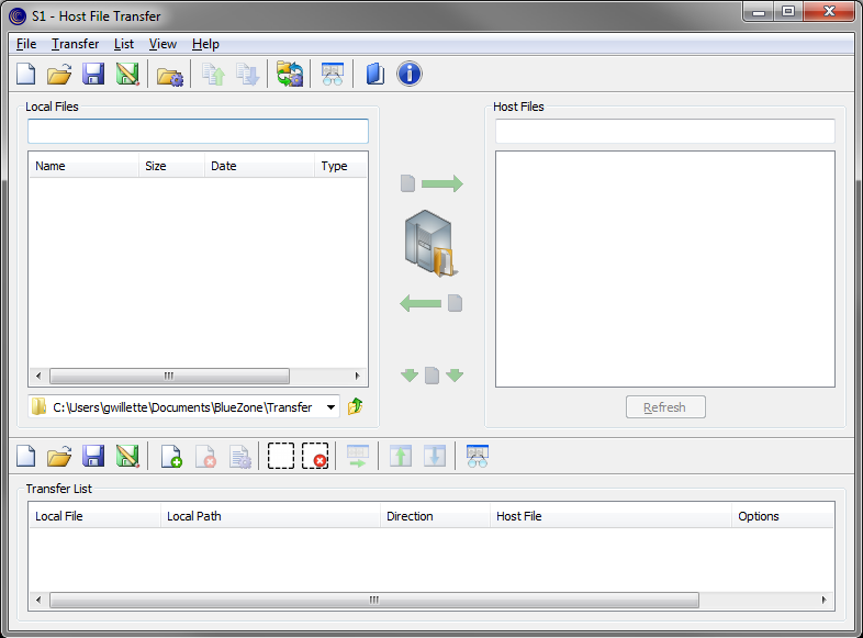 The IND$FILE transfer is controlled through the Host File Transfer window. The Host File Transfer window provides an easy-to-use graphical interface. You can send or receive a single file to or from the host. You can also create transfer lists to easily preform batch file transfers.
