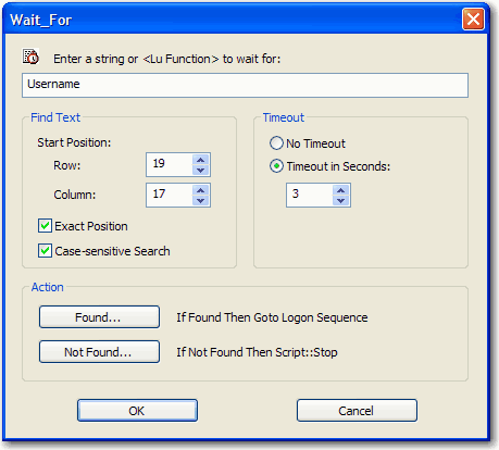 For example, you can wait for the desired text string starting from the very upper left hand corner of the host screen and search to the very end of the screen. Or, if desired, you can wait for the desired text string starting at a specific row and column location, or you can wait for the desired string only when found at a specific row and column on the host screen.