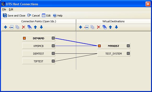 The UTS Host Connections dialog can be used to visually manage multiple host connections.