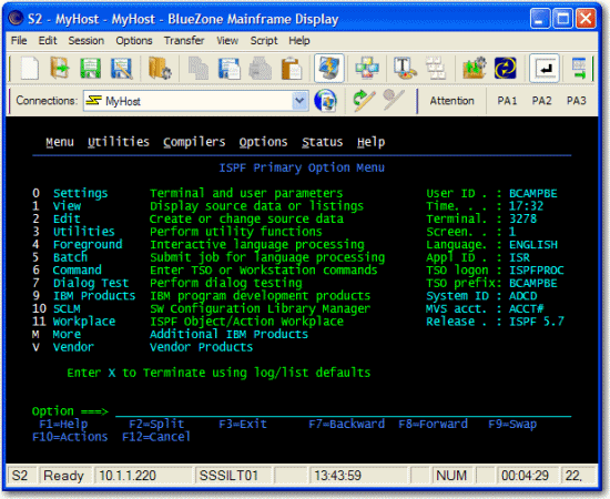 - Launch a BlueZone Mainframe Display session and connect